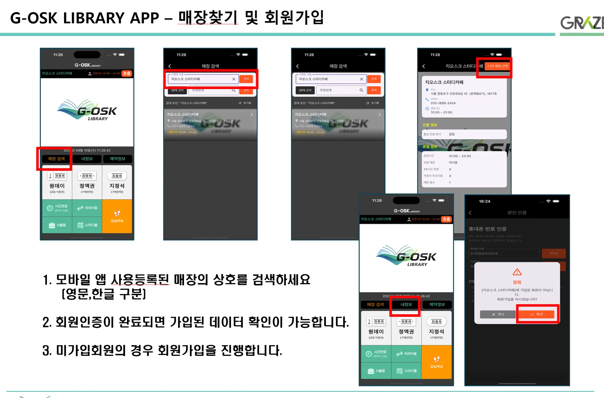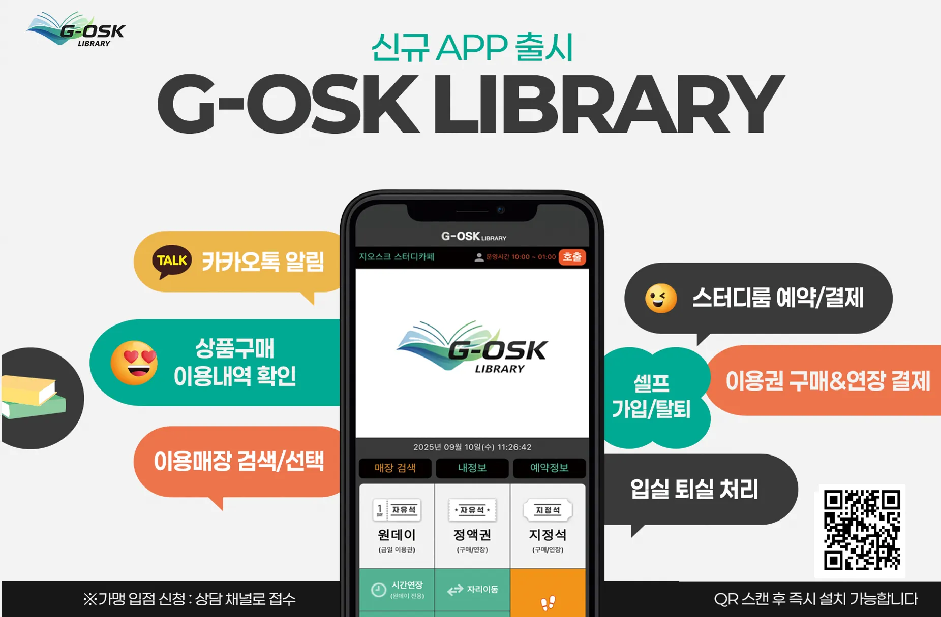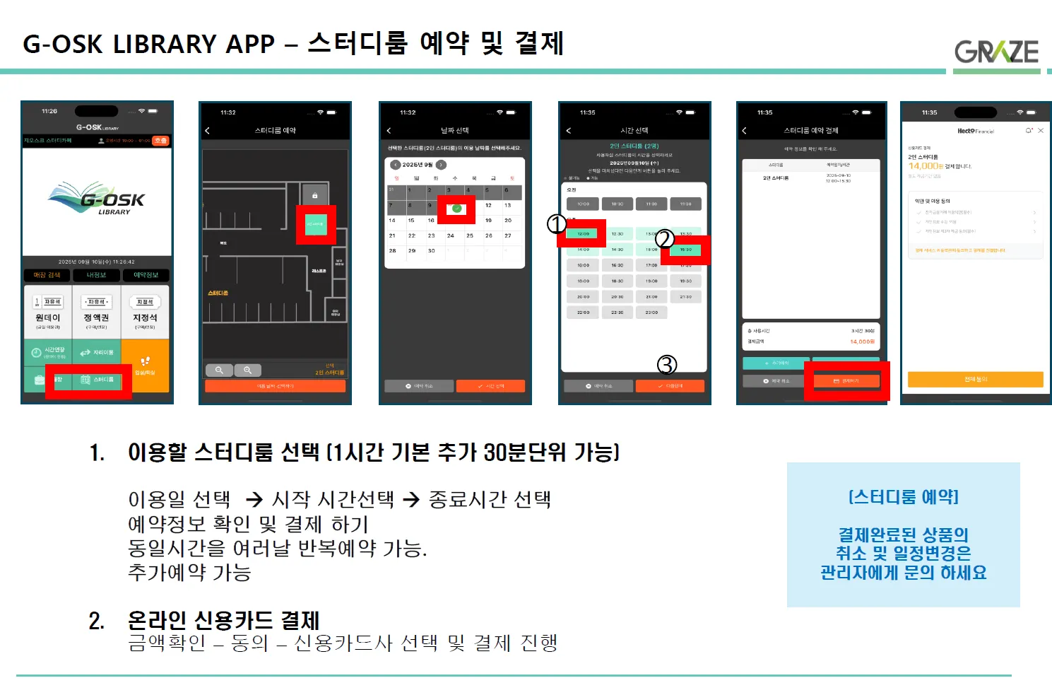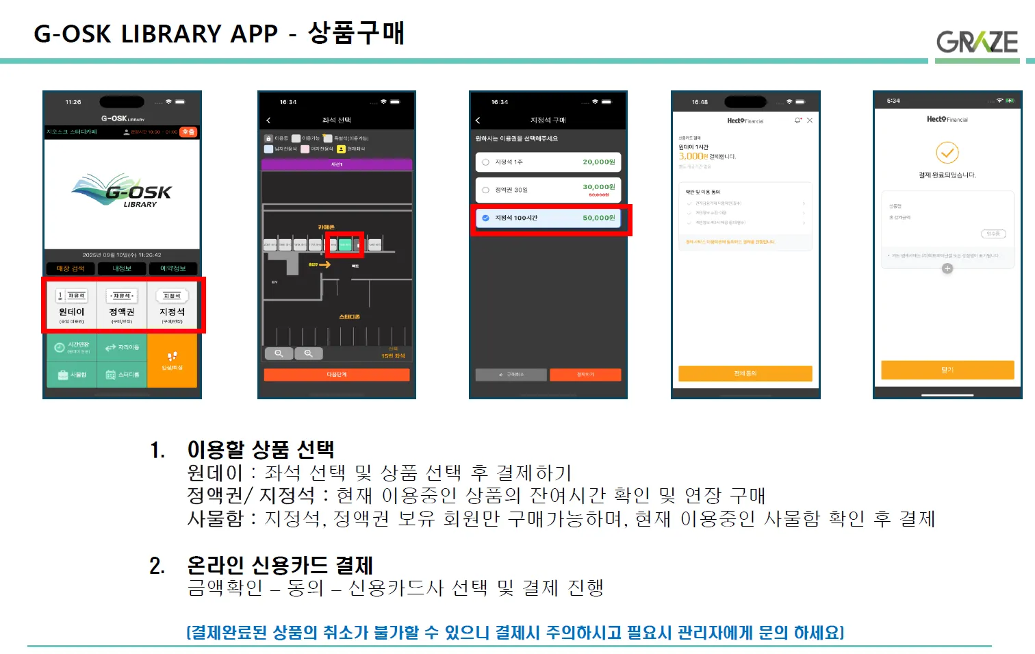 모바일앱을 통한 결제 / 스터디룸 예약시 결제 링크 전송 / 상품의 구매 예약결제(링크)전송 가능.