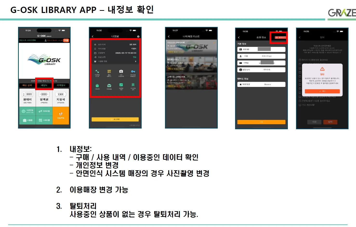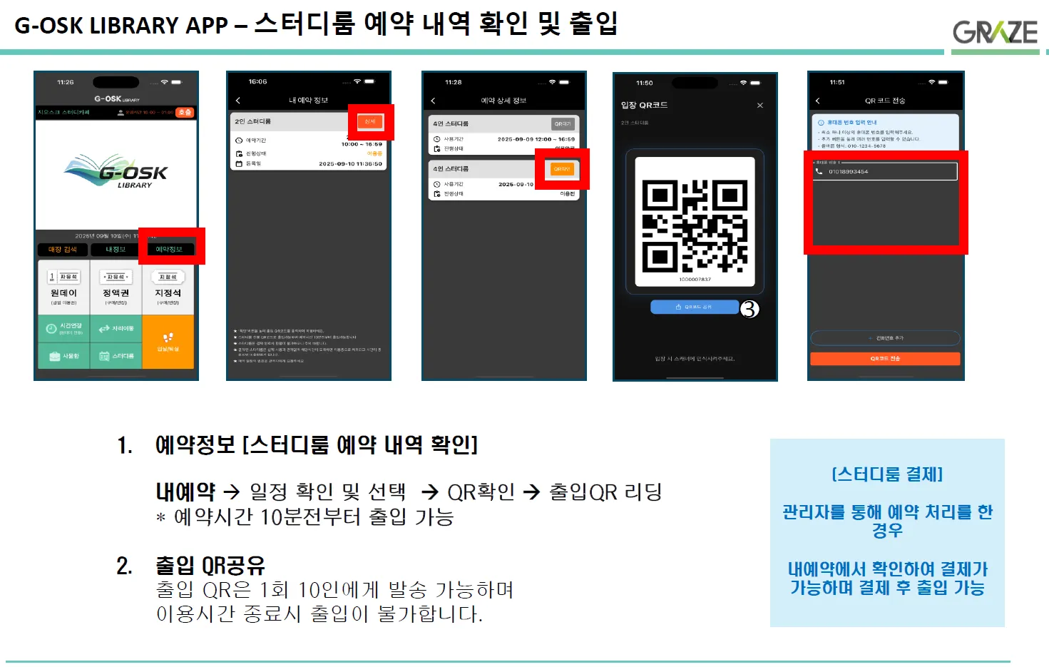 기본적인 사용은 키오스크와 동일한 기능을 갖고있으며, 내정보 확인 및 스터디룸 출입 QR공유가 편리합니다.