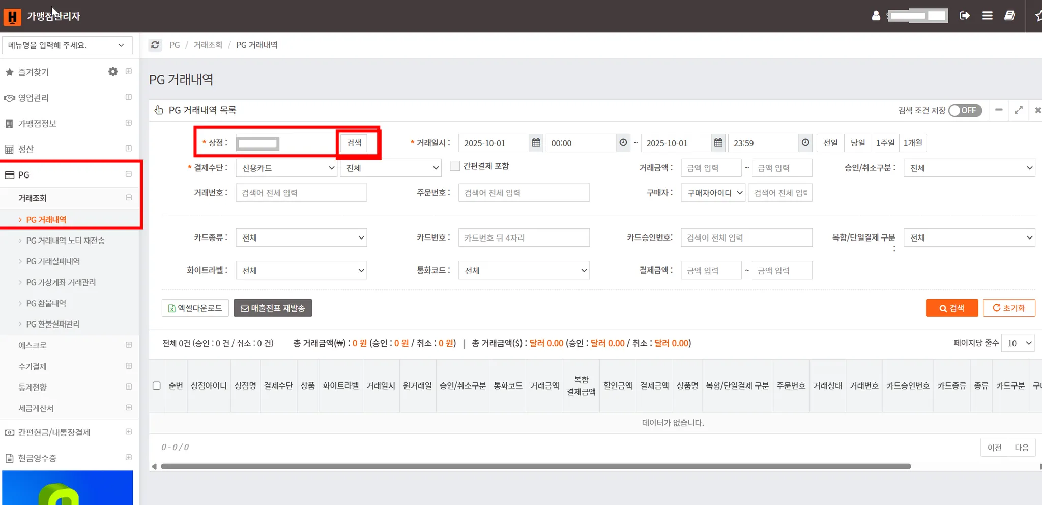 헥토파이낸셜 관리자 로그인 - PG거래내역조회 - 상점검색버튼