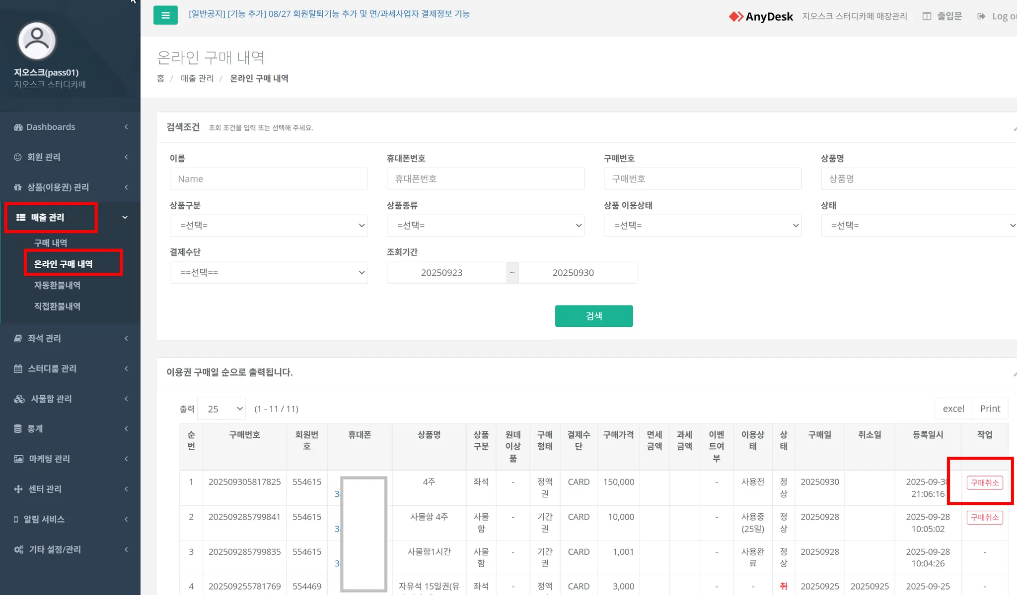 지오스크 관리자페이지 - 매출관리 - 온라인구매내역 (APP 결제 내역)