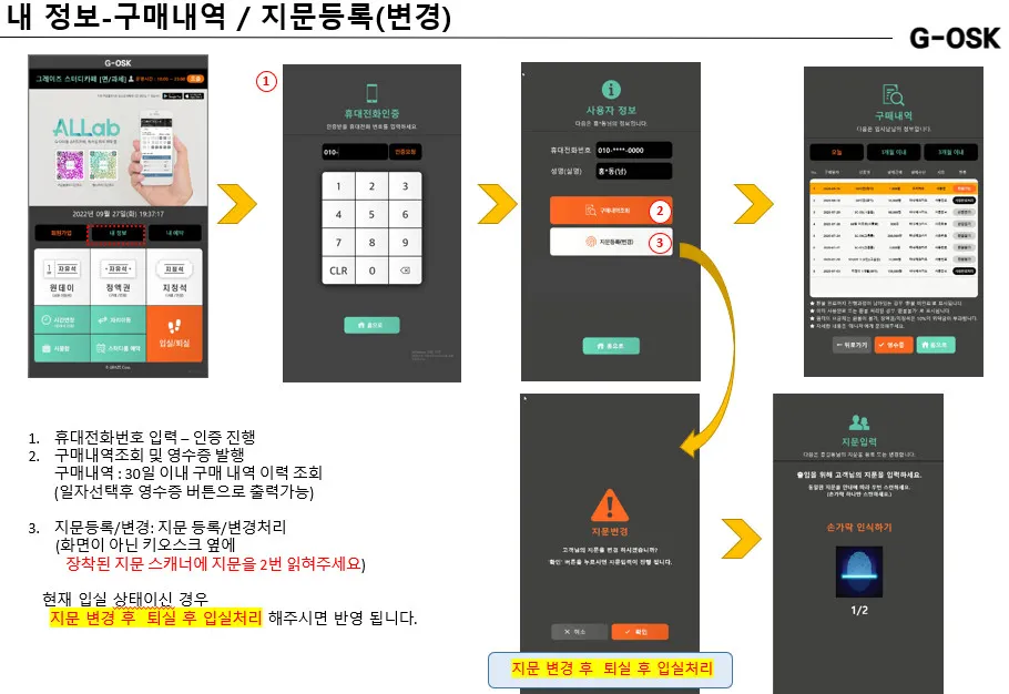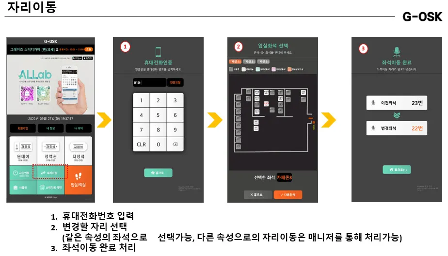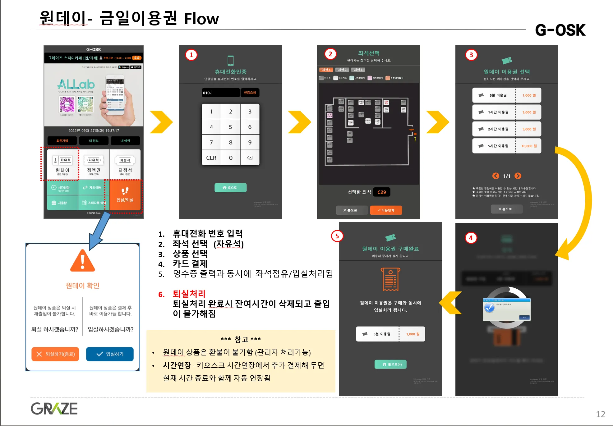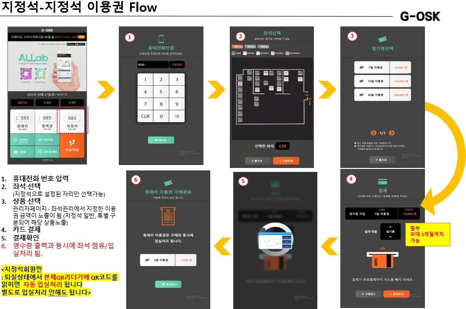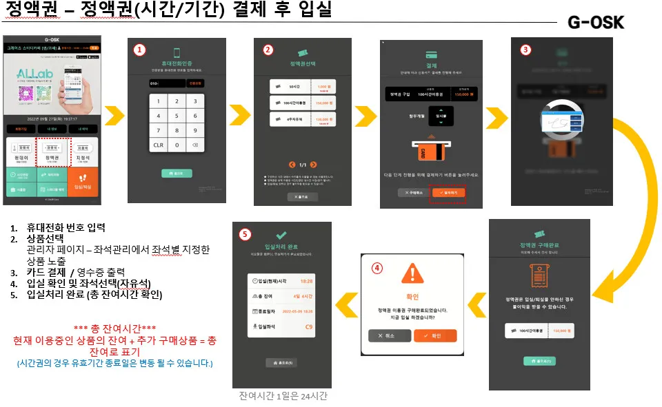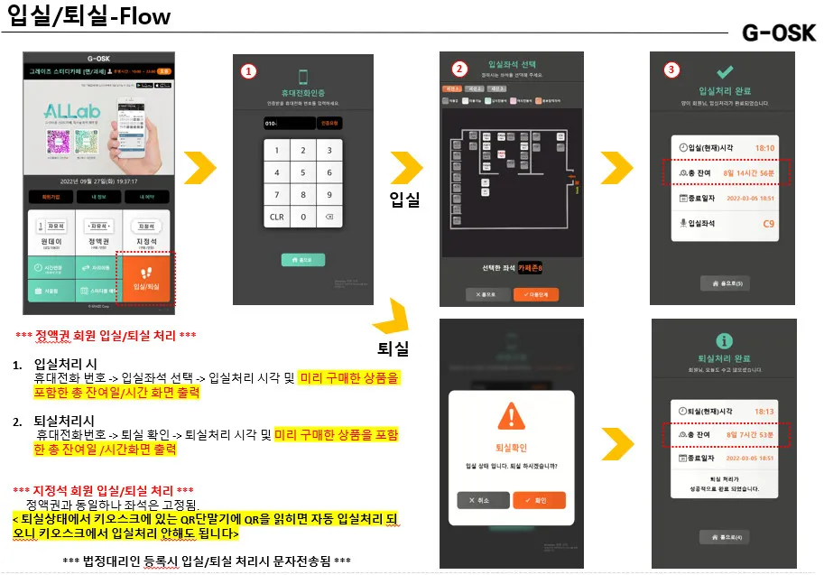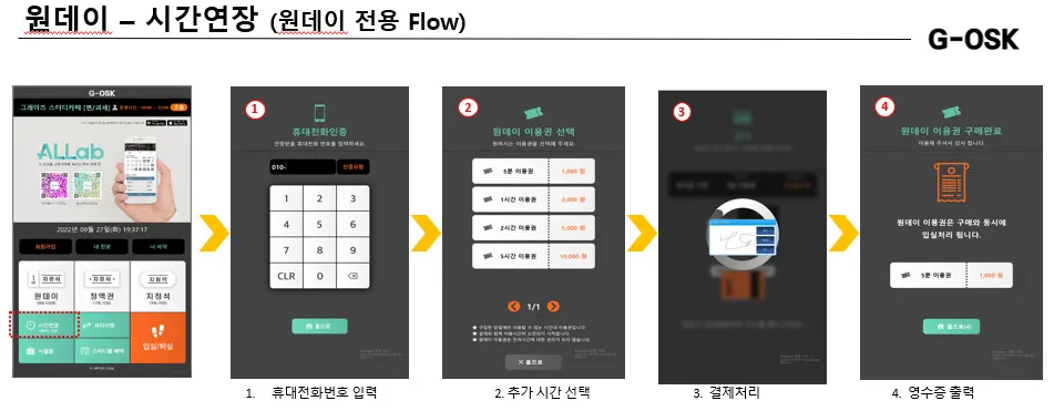 원데이권의 경우 구매시 입실은 자동으로 이루어지며, 퇴실은 잔여시간이 삭제되어 퇴실처리가 가능합니다.