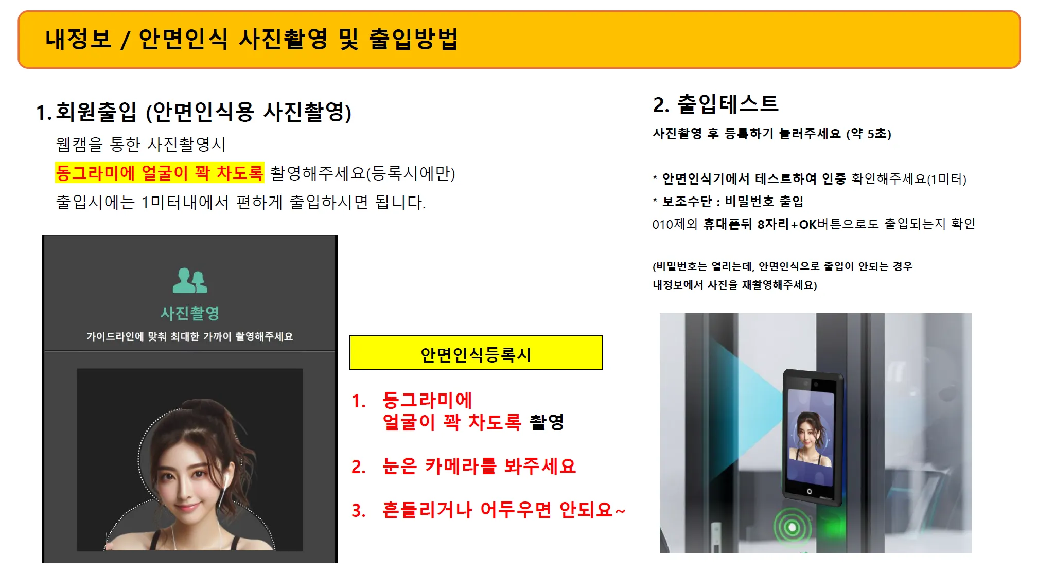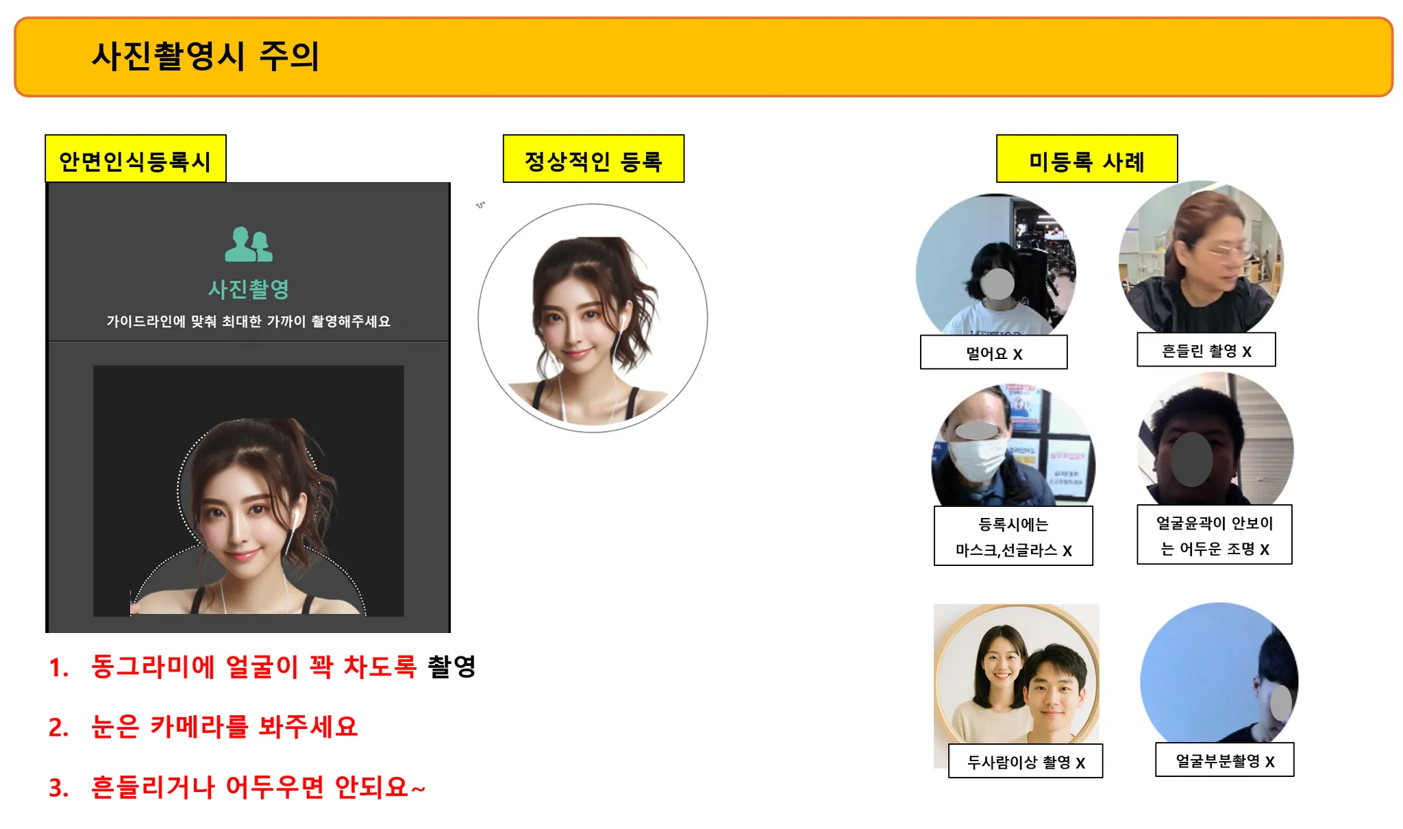 1-1 안면인식 등록시, 얼굴만 꽉차게 촬영해주세요.
