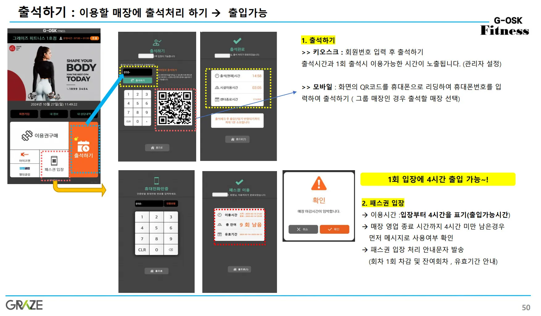 이용권 구매 후 꼭 ‘출석하기’ 처리 해야 출입이 가능 합니다.