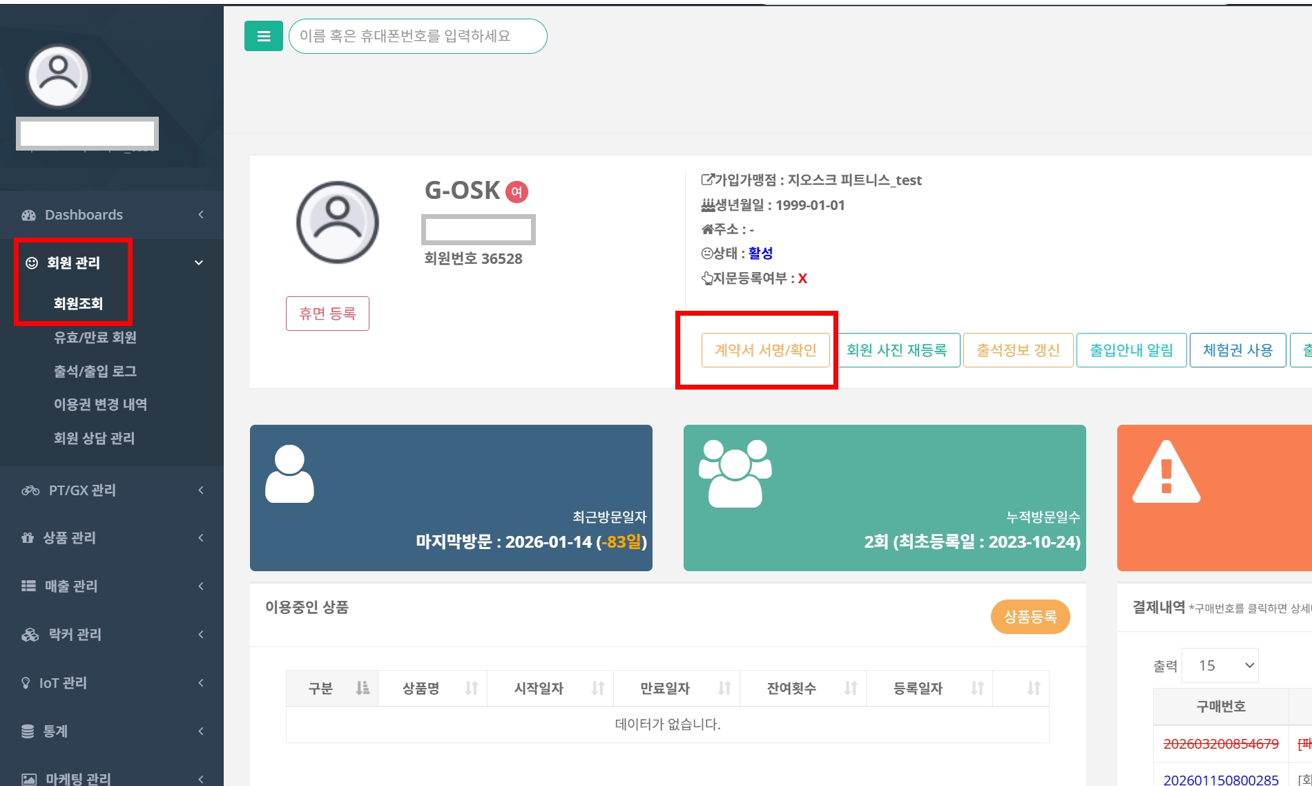 회원조회에서 계약서 서명창을 눌러 서명을 진행하시거나