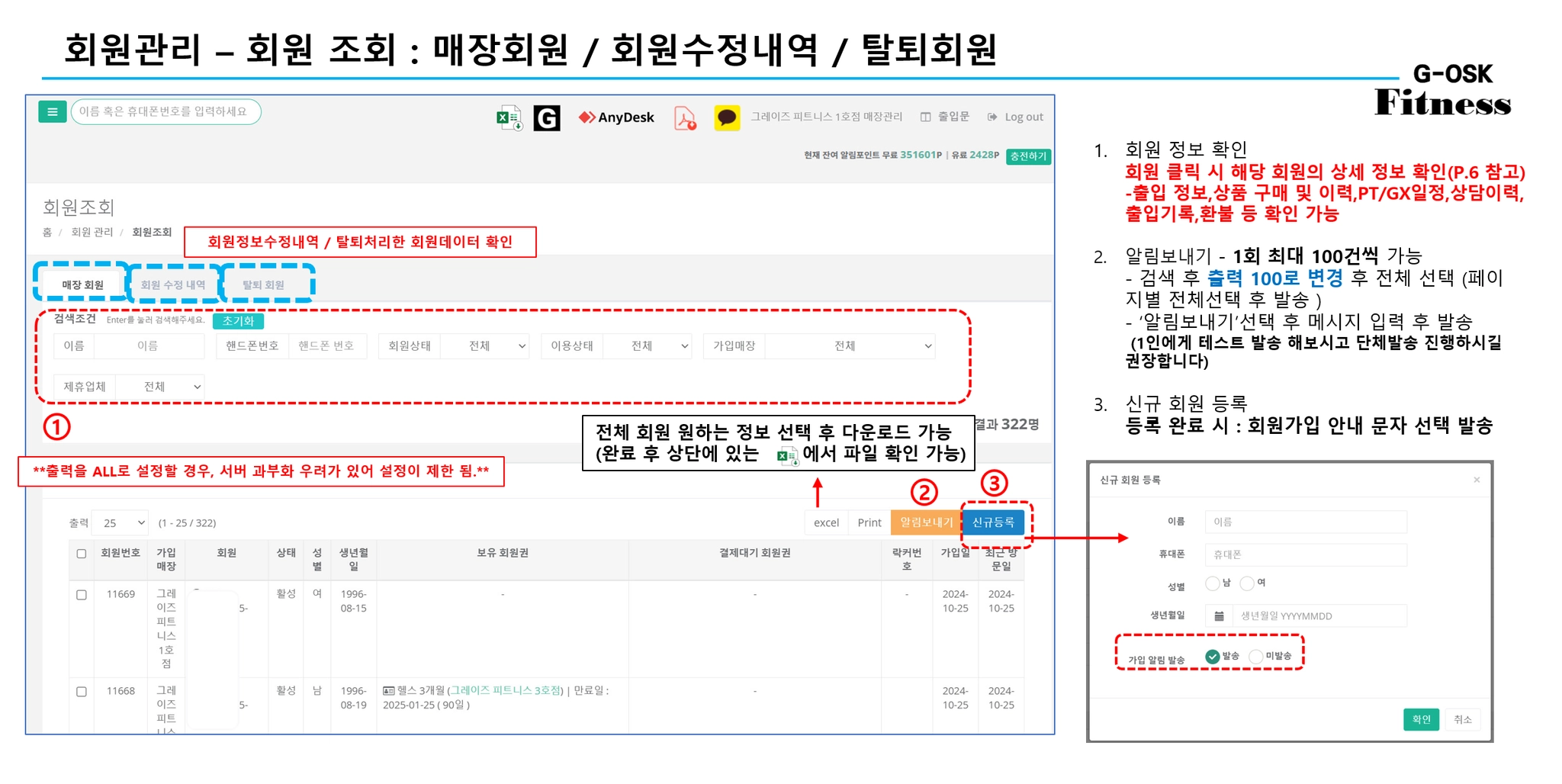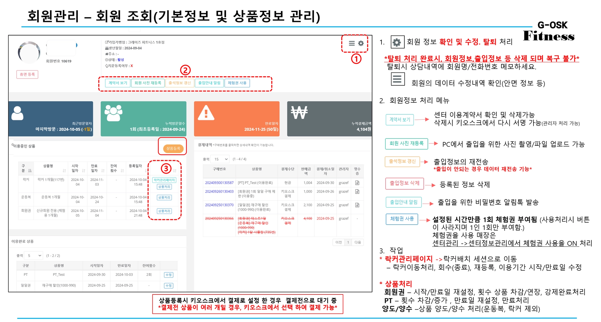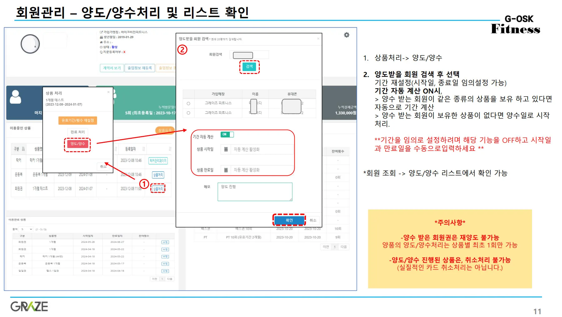 1.양도/양수 진행할 회원 상세정보로 이동 2. ‘상품처리→양도/양수’ 버튼을 눌러 양도/양수 처리