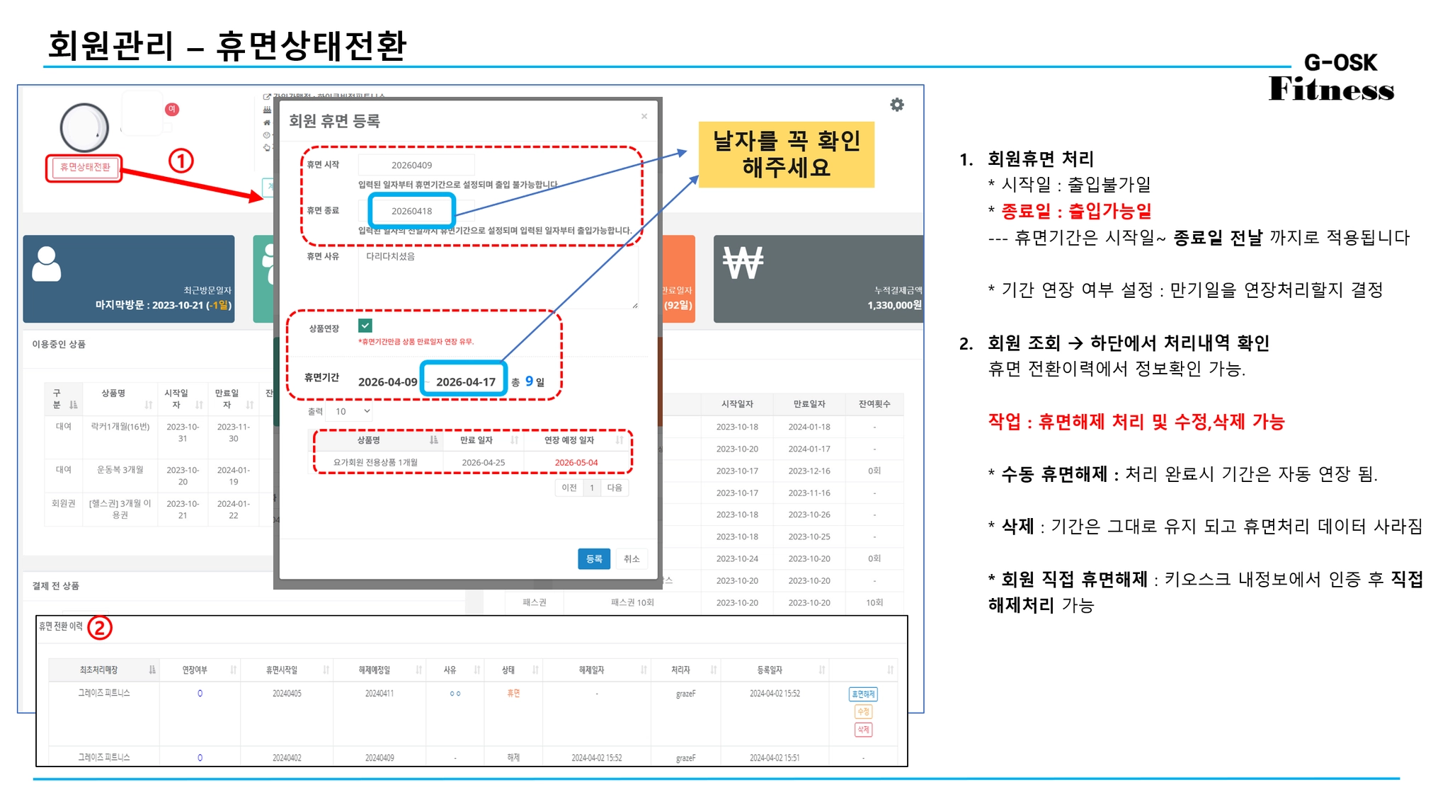 관리자 : 해제 처리(수동) , 설정된 일자부터 출입가능되도록 처리(휴면기간 확인)